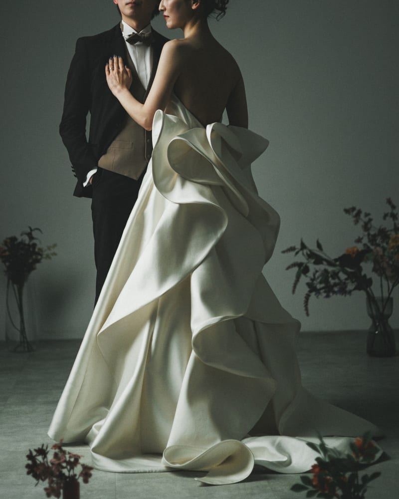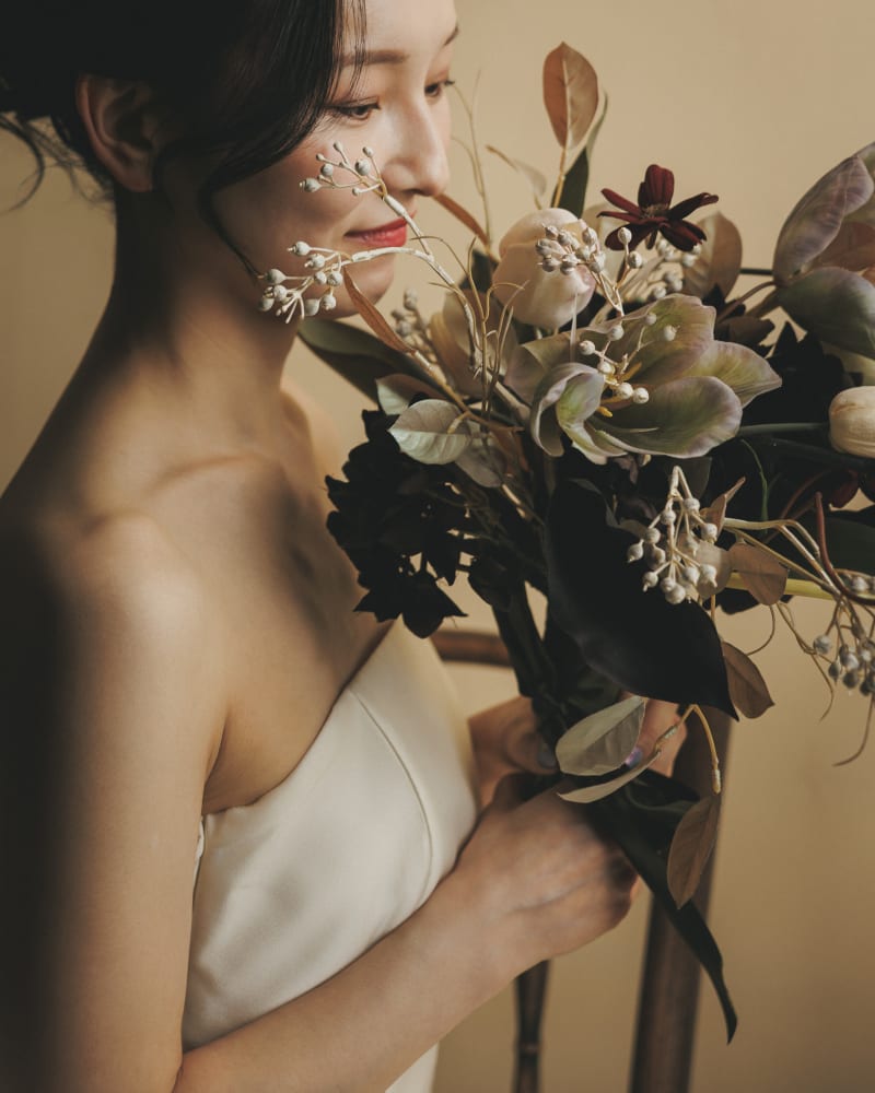 スタイリッシュなタキシードと、洗練を極めたウェディングドレス。お二人のこだわりが詰まったコーディネートに、深みのあるアンティーク調のブーケが彩りを添えます。見つめ合う横顔、重なり合う手元、そしてドレスの裾に寄り添う一輪の花。細部にまでストーリーを忍ばせたライティングが、お二人の佇まいをよりドラマチックに演出します