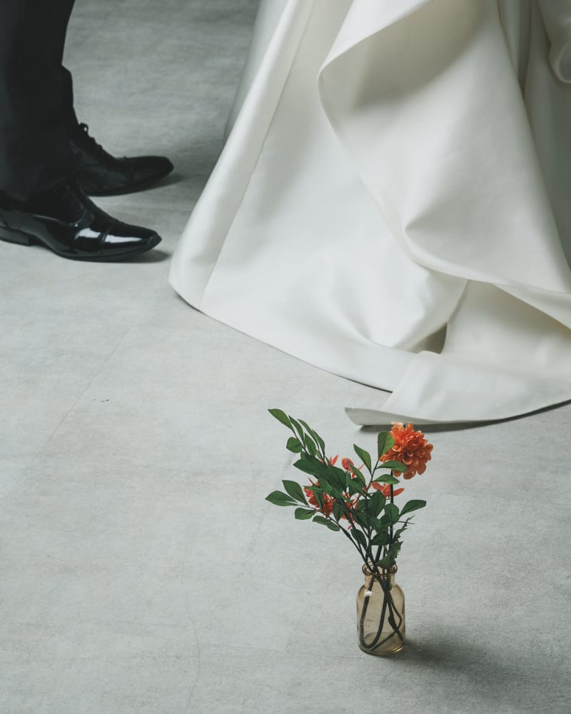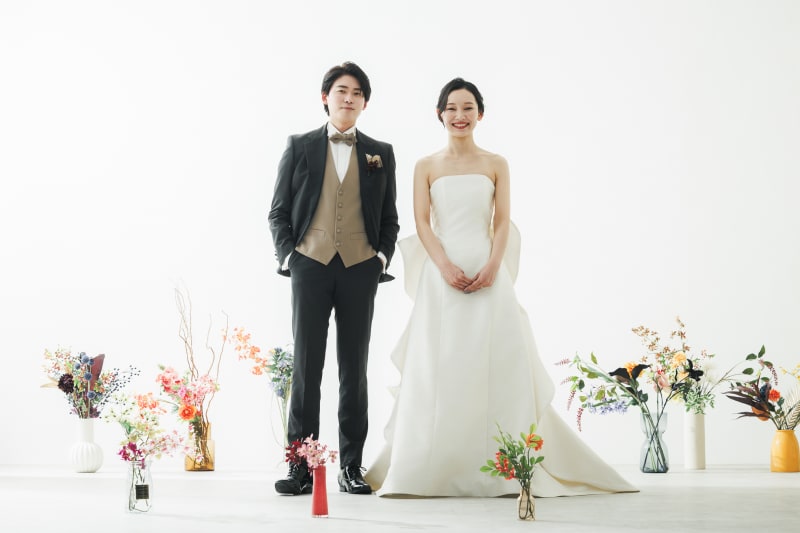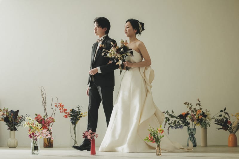 真っ白なキャンバスに色とりどりの花々を散りばめた、アーティスティックな撮影。飾りすぎない潔い空間だからこそ、お二人の自然な立ち姿や空気感が鮮やかに際立ちます。モダンな感性と、ふとした瞬間にこぼれる等身大な笑顔。そんな「今」この瞬間の煌めきを、一枚の絵画のように切り取った特別な時間の始まりです。