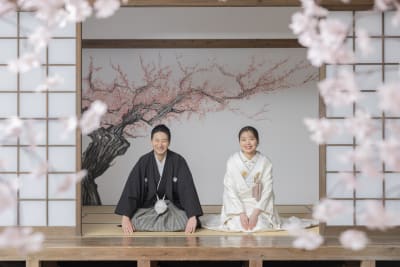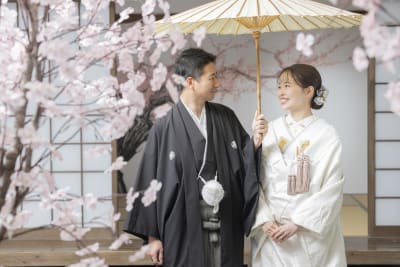 最初はキリッとした和装からのスタート。満開の桜をバックにしたショットや、伝統的な和傘を使ったポーズは、まるで映画のワンシーンのようでした!最初は少し緊張されていた様子のお二人でしたが、撮影が進むにつれてリラックスした表情になり、見ているこちらまで温かい気持ちになるような穏やかな時間が流れていました。