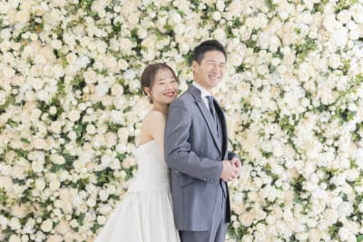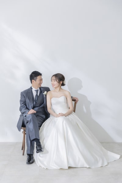 洋装の撮影では、お二人の弾けるような笑顔がさらに全開に!お花に囲まれた華やかなセットの中、時折見つめ合って笑い合うお二人の姿はもとっても素敵です。お互いへの信頼感が伝わってくる、素敵な瞬間をたくさん収めることができました。