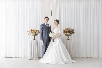 続いては、ガラッと雰囲気を変えてウェディングドレスとタキシードへ。
