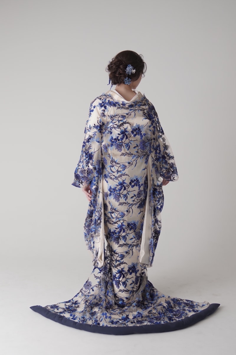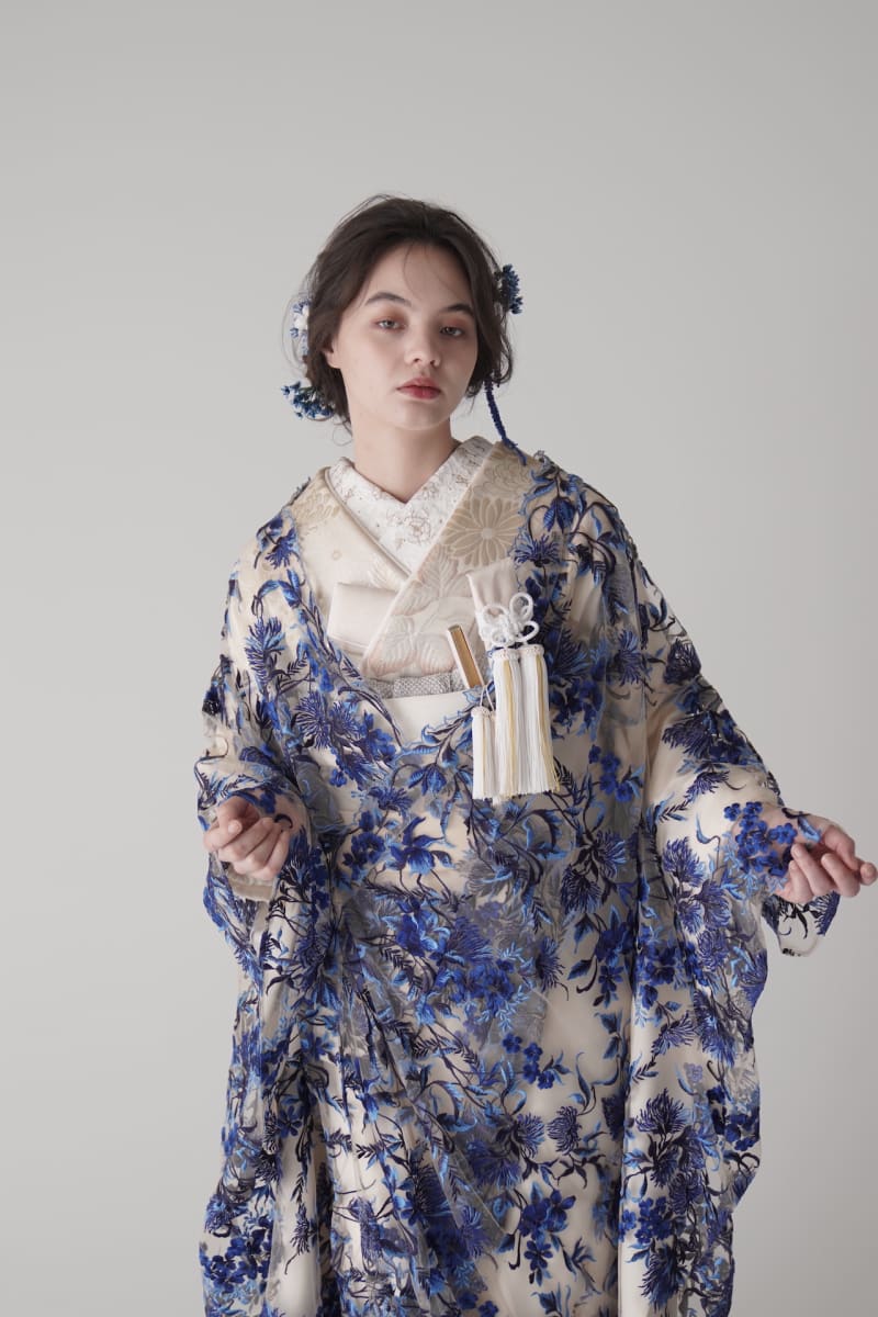 チュールに蒼の花々の刺繍が入っていることによって柔らかさと凛とした強さを併せ持っていて洗練された印象を与えます!