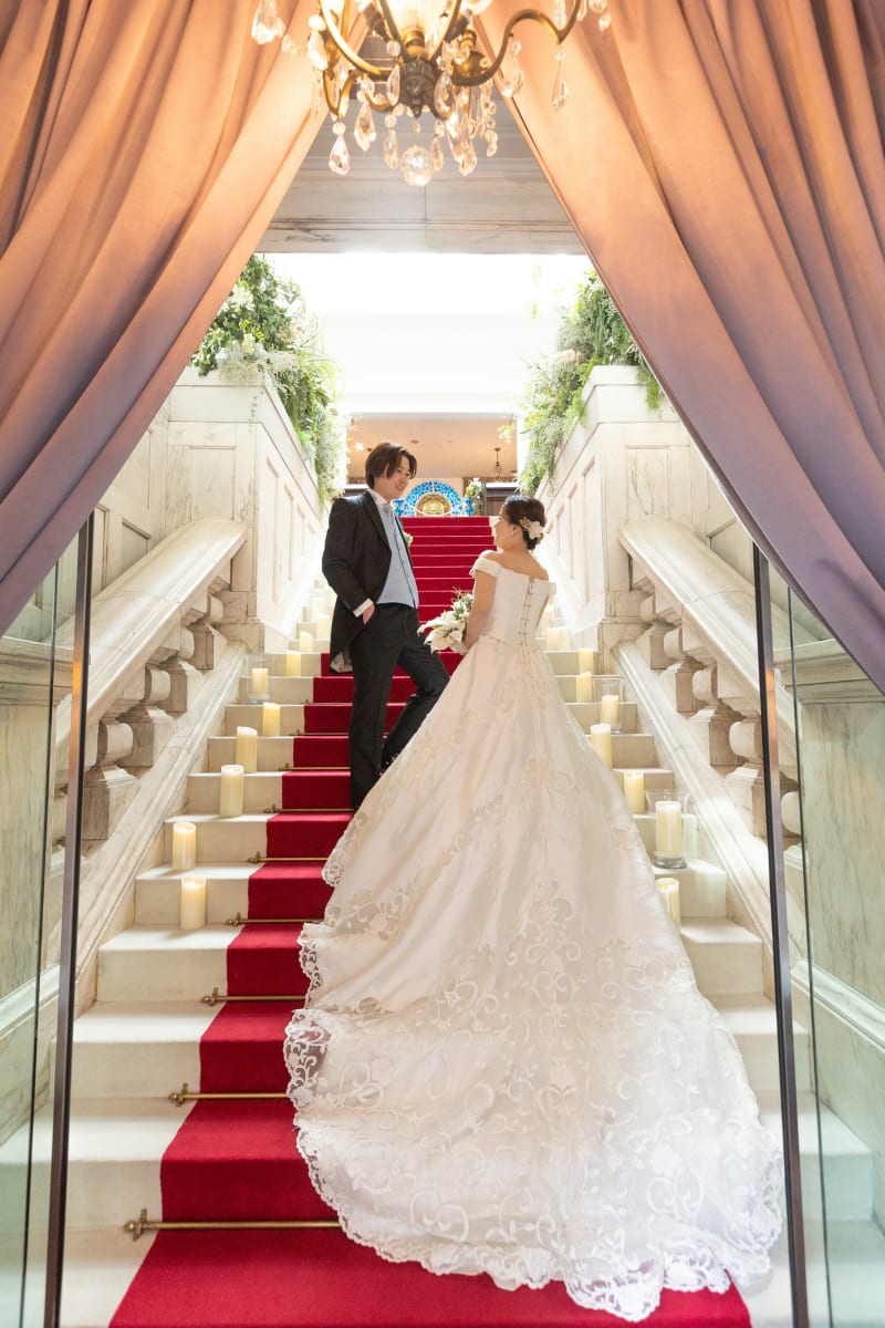重厚な大階段に真っ赤な絨毯が映え、お二人の立ち姿がまるで映画のワンシーンのような格調高さを感じさせます。