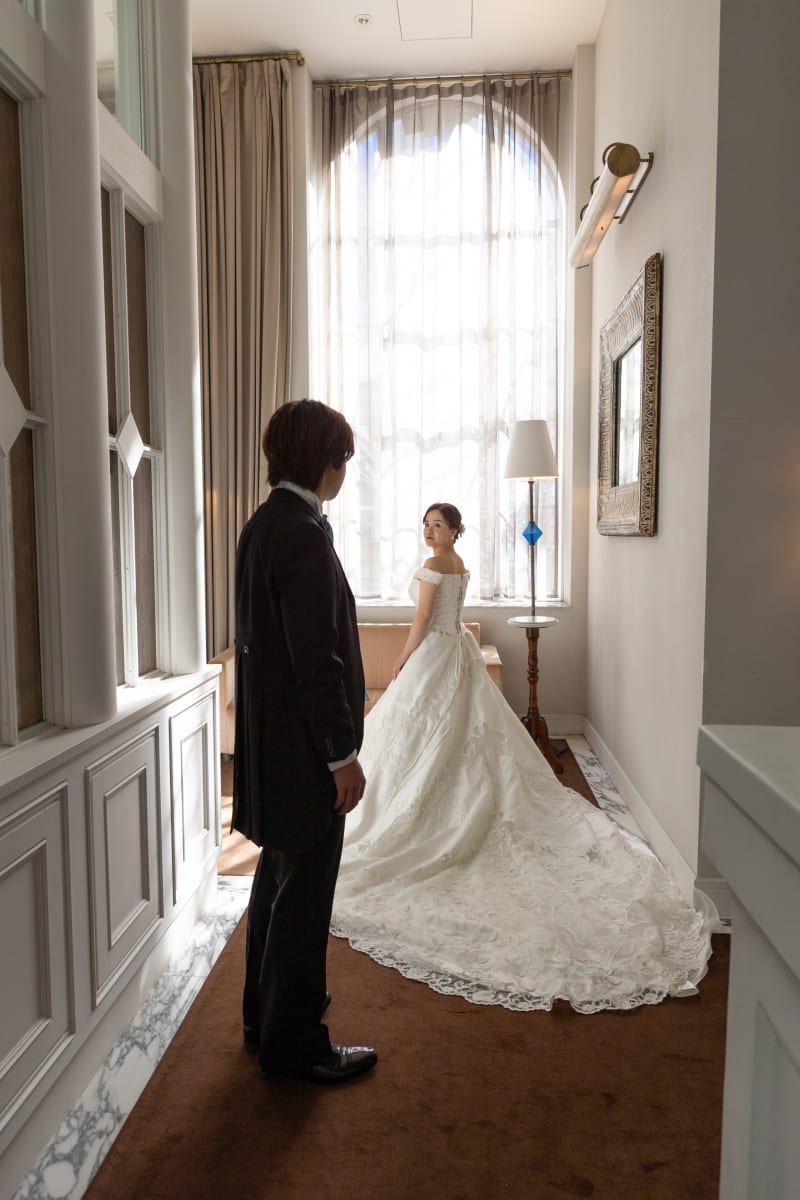 高いアーチ窓から差し込む柔らかな光が、お二人を包み込むような優雅で静謐な空気感を作り出しています。