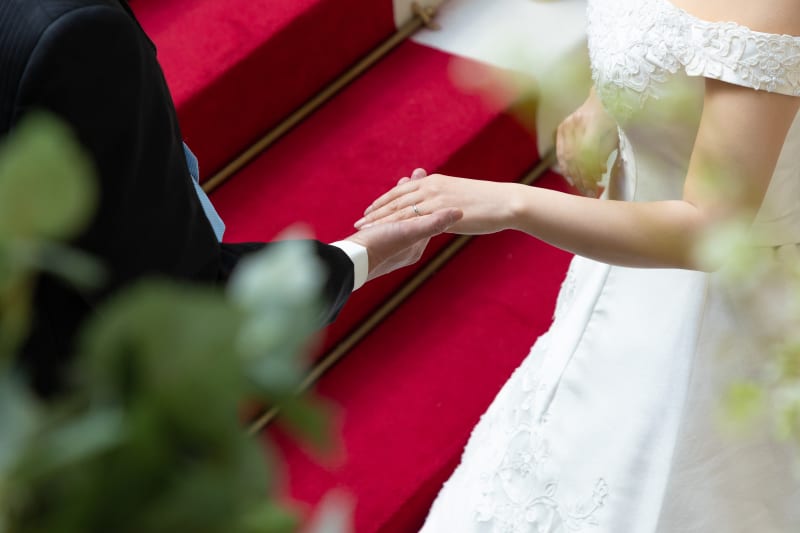 お二人の手が重なり合い、薬指に輝く指輪がクローズアップされた、非常に情緒的で温もりを感じる一枚です。