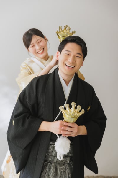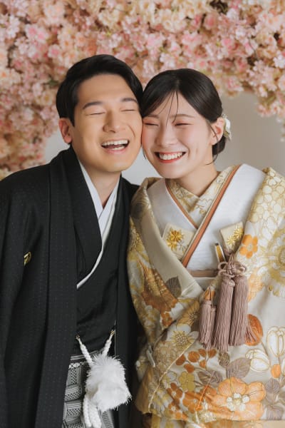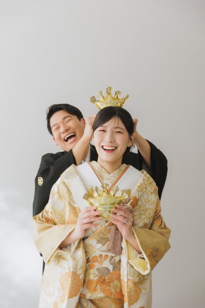 お持ち込みいただいたピンクゴールドのバルーンから撮影スタート。顔を見合わせて笑うおふたりの姿に、スタジオ内も一気にハッピーな空気感に包まれました。
