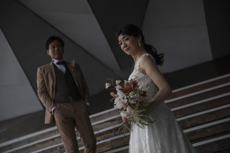 ブーケを手に近付く新郎様。アンニュイな表情が似合う新婦様。