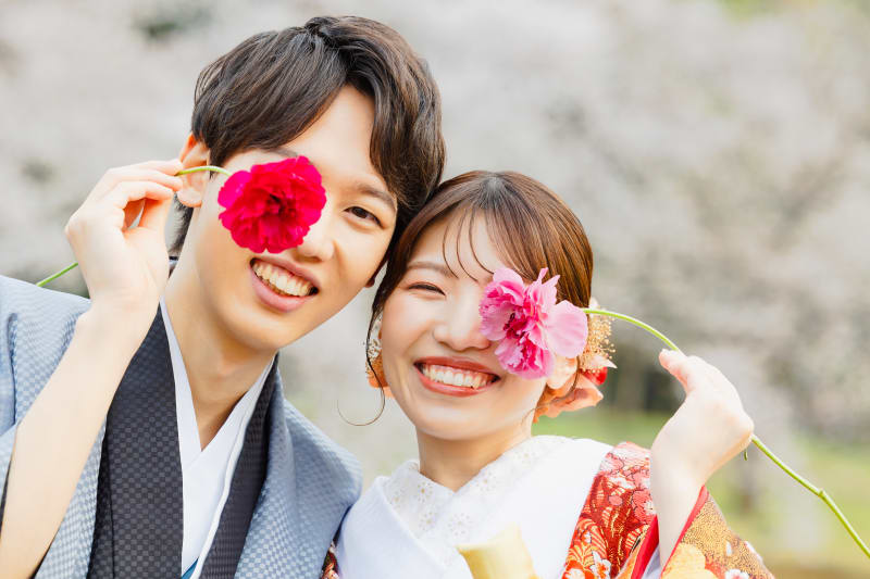 和装の凛とした雰囲気の中にも、おふたりらしい「遊び心」が光る一枚。新郎様が手に持つ一輪の赤い花と、新婦様が手に持つ一輪のピンクの花が、個性を引き立てています。