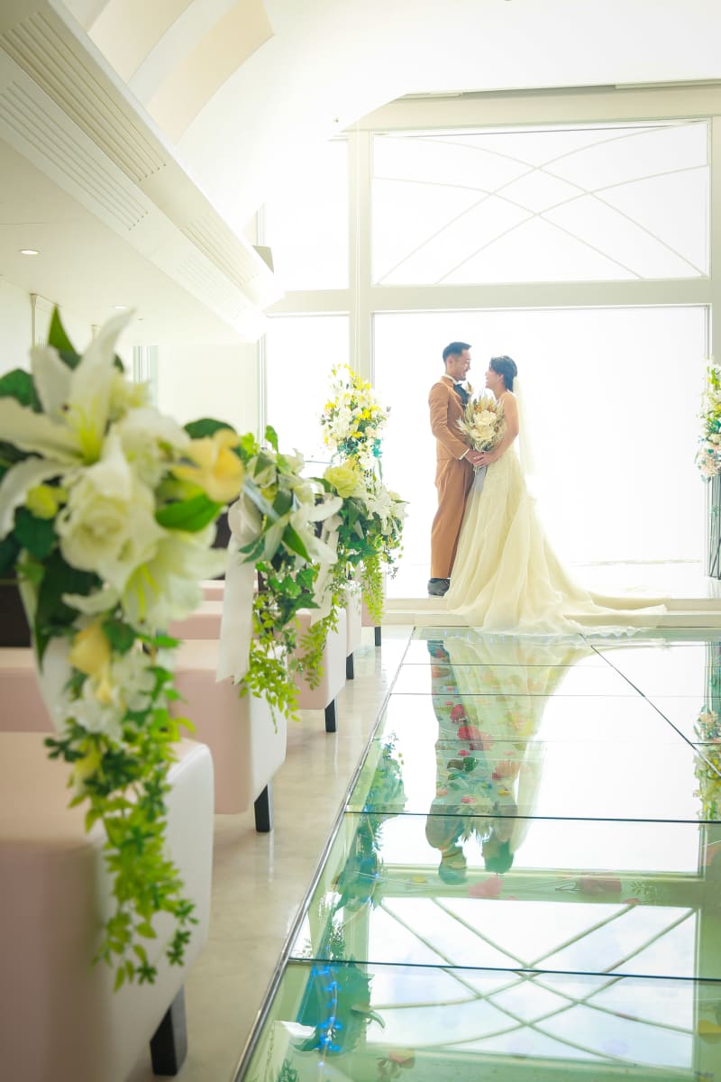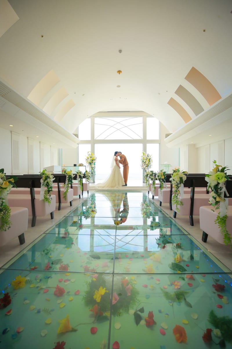 こんな風にガラス張りのバージンロードや定番の赤色のバージンロードなどお好みのテイストがございましたらご相談ください◎