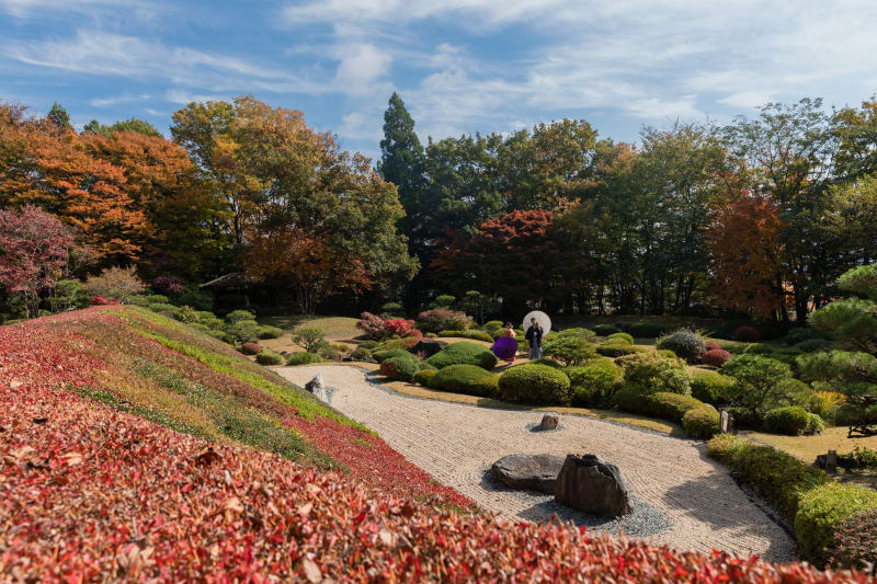 入ると目の前に飛び込んでくる美しい庭!青い空にさまざまな植物の紅葉が美しい。