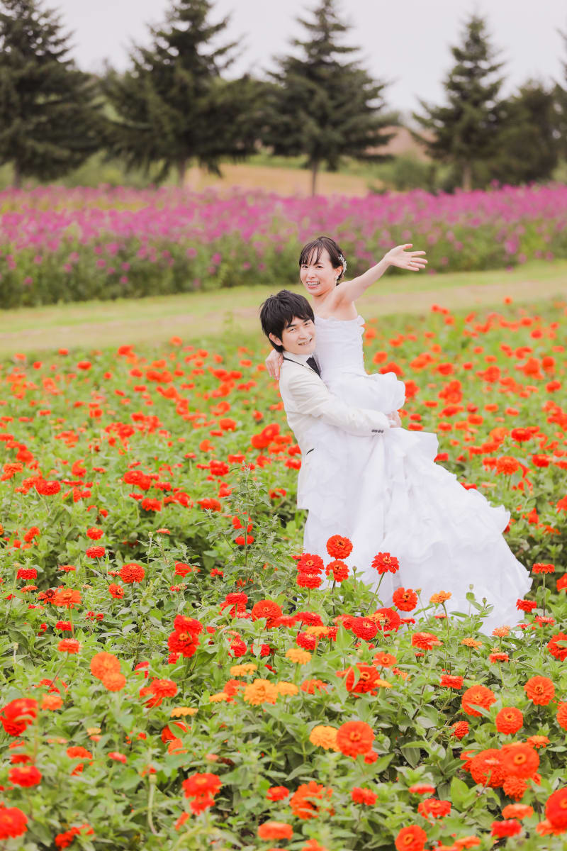 オレンジのマリーゴールドやピンクのクレオメが可愛いらしい一枚♪ ウェディングならではの抱っこのポーズにもぜひ挑戦してみては?