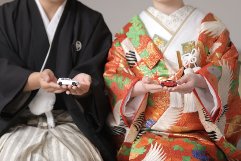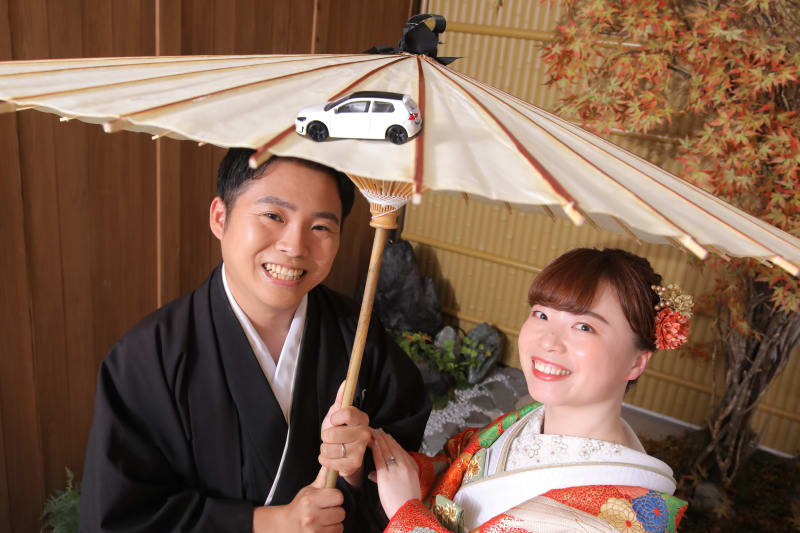 こちらのミニカーは普段お二人が乗られている車です。 手に乗せて撮影するのもいいですし、和傘など他の小物と組み合わせて撮るのもステキです♩