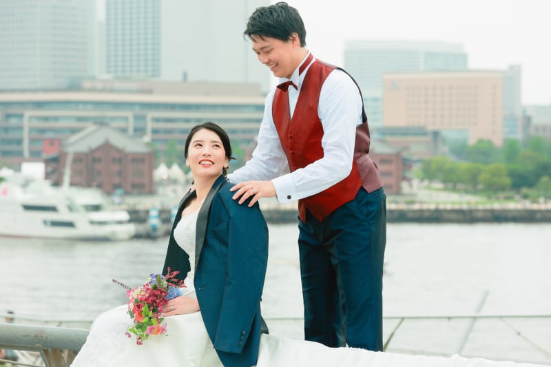 旦那さんのジャケットをお嫁さんにかけてあげて。ベスト姿も新鮮ですね。ぜひ撮影いただきたいカットです♡