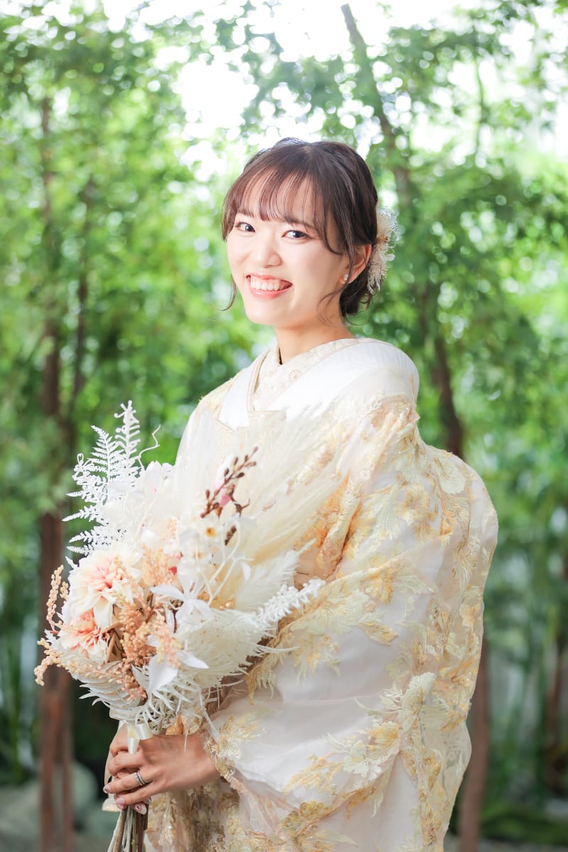 お嫁さんがこだわってオーダーしたオリジナルブーケをお持ち込み!木漏れ日で明るい雰囲気に✳︎