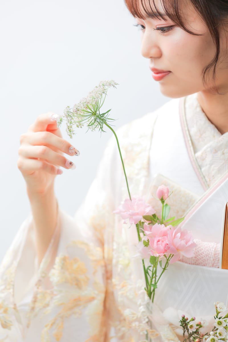 ゆらゆら揺らめくレースフラワーのお花や淡い色のバラを花嫁小物風にあしらって。