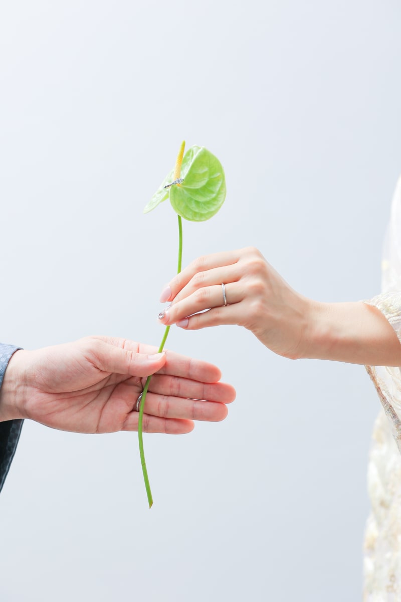 緑のアンスリウムのスラリとした形が印象的・・先にもきらりと光る指輪があるんですよ