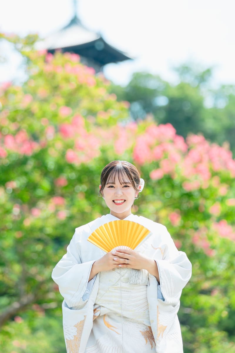 三重の塔+百日紅のピンク+お嫁さんの白無垢+金色の扇子!色と形が可愛い一枚です!