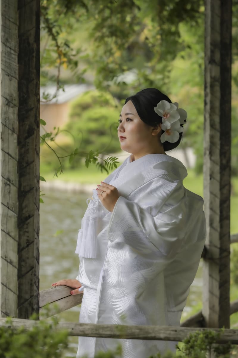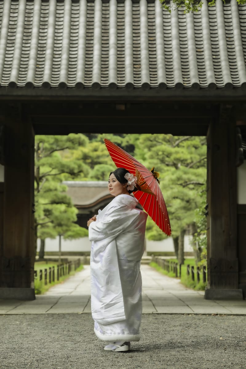 緑の背景に、白無垢と赤の和傘がよく似合います