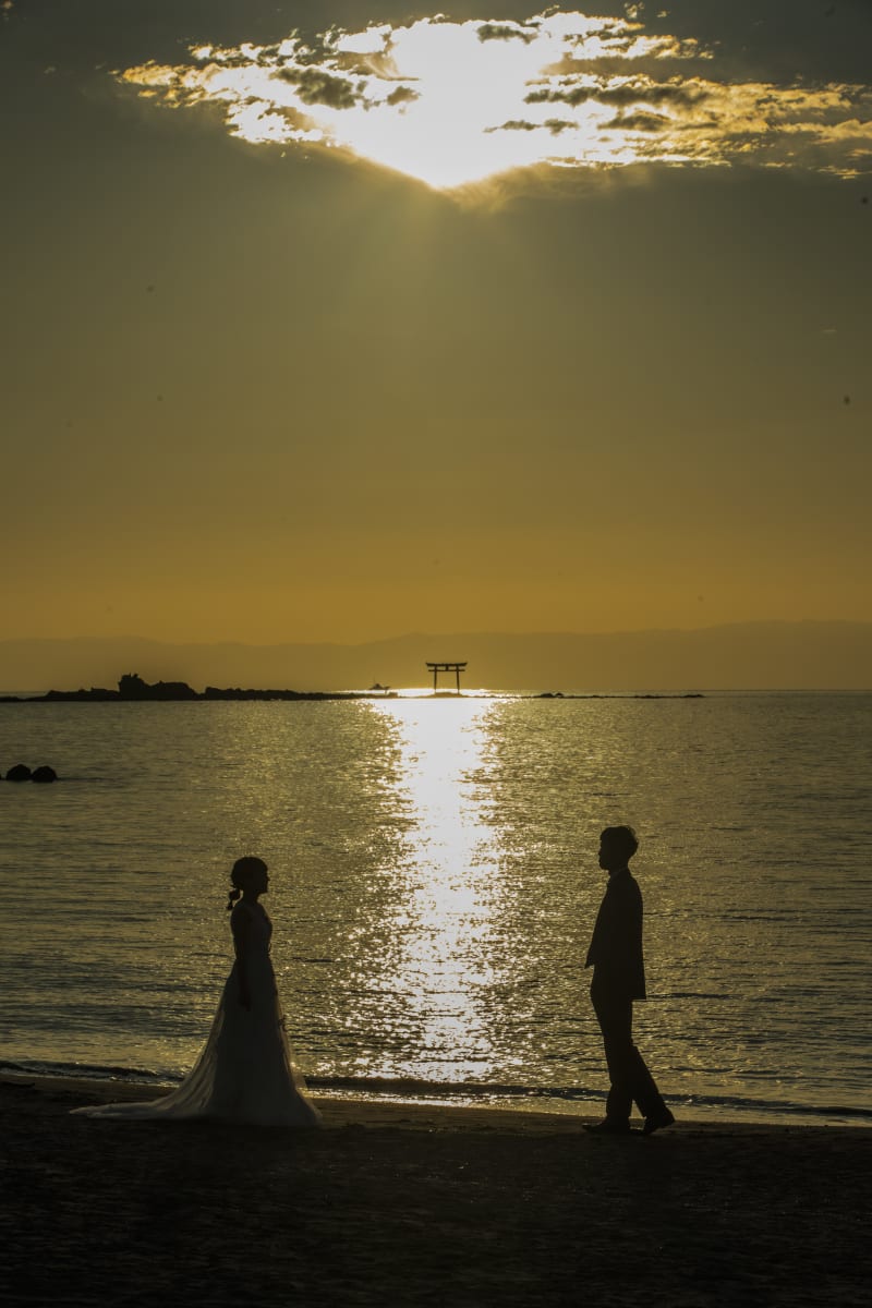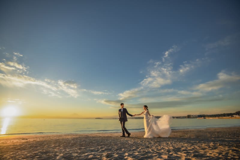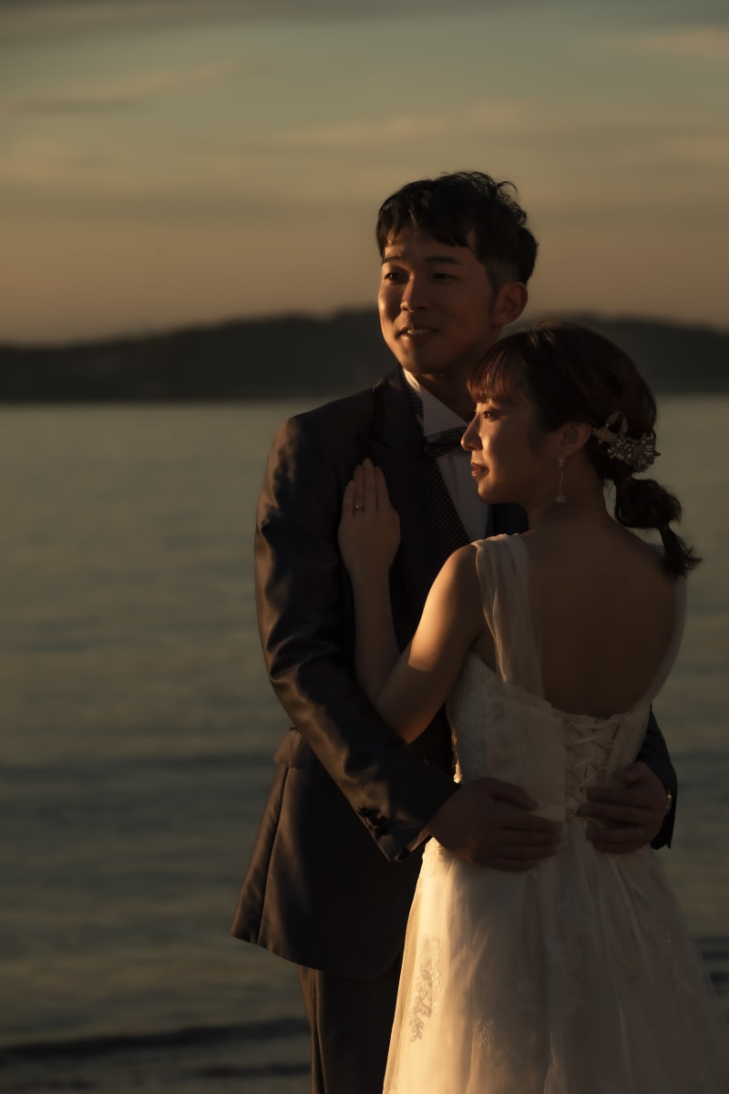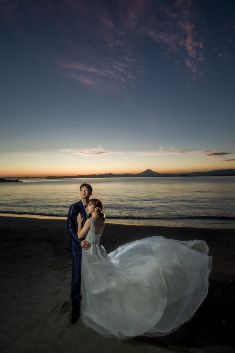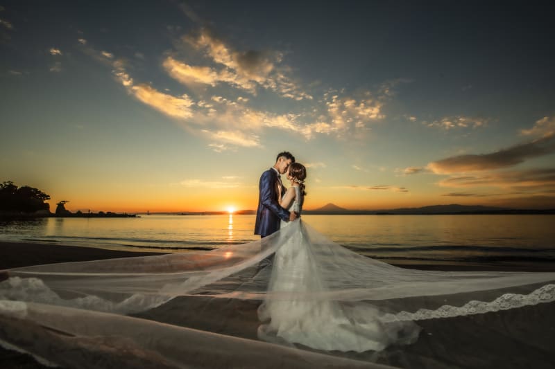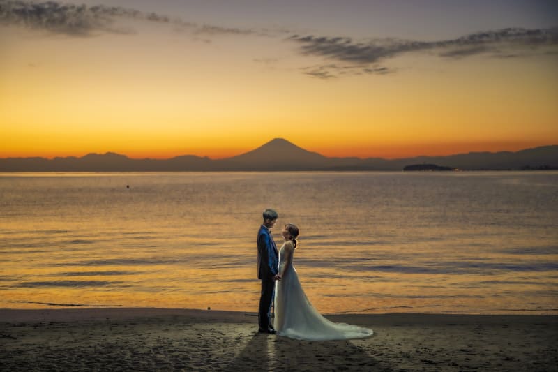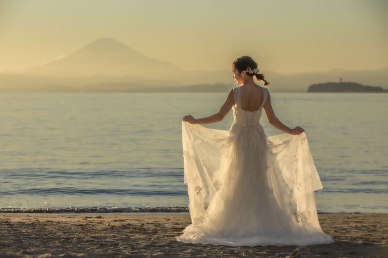 新婦様の姿の背景にあるのは夕日に照らされた富士山と江ノ島です
