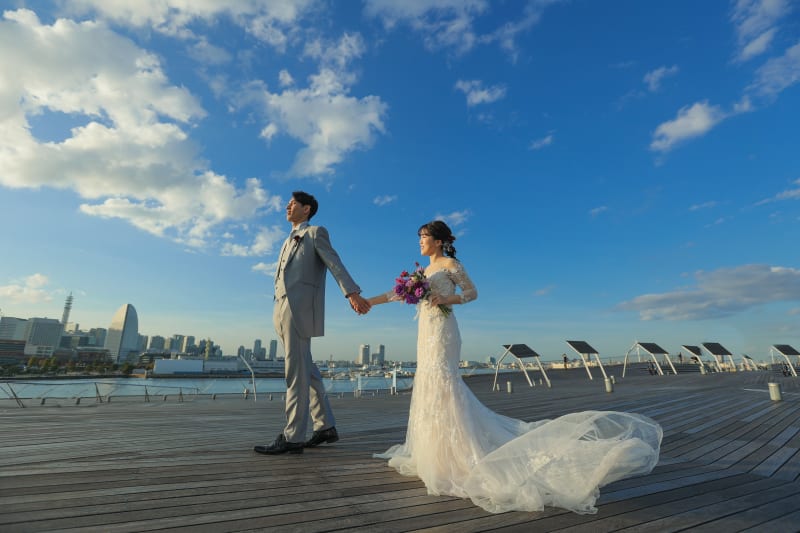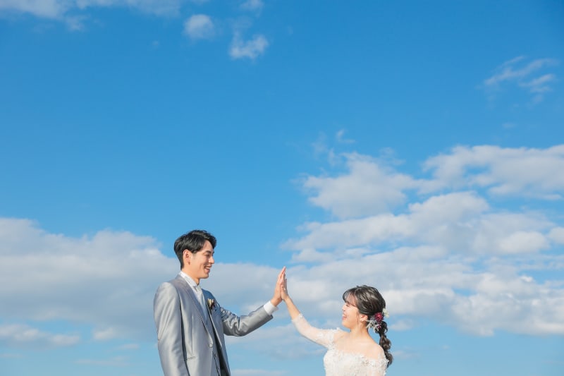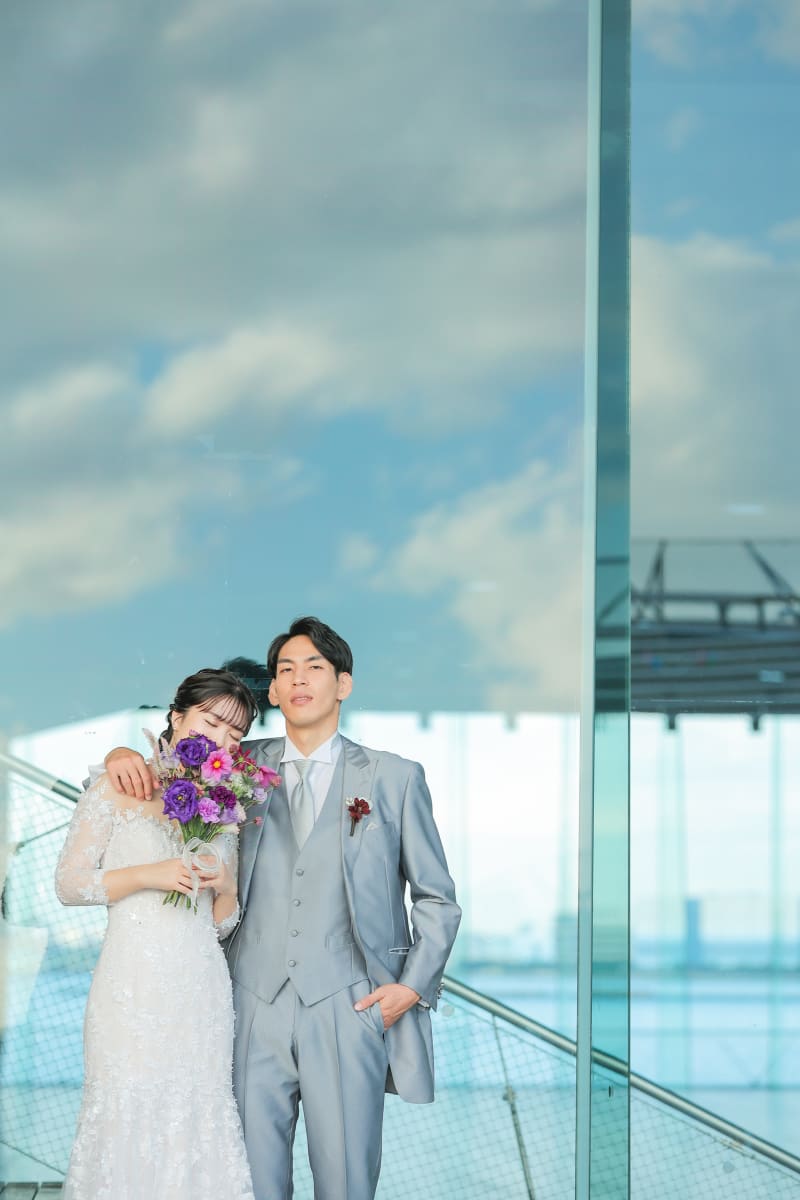 大きなガラス面に青空を投影して幻想的に。旦那さんには渾身のドヤ顔を!とリクエストさせていただきました^^