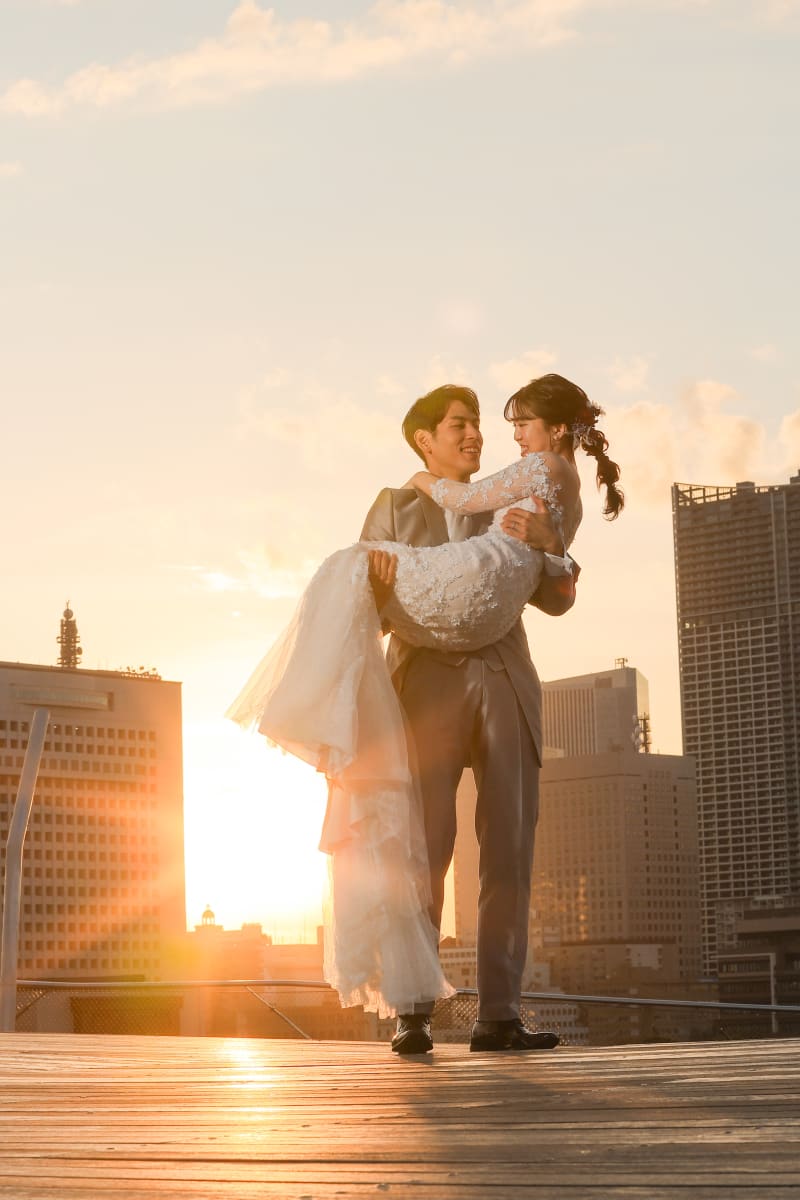 旦那さんが軽々お姫様だっこ!夕陽を受けて映画のワンシーンのようでした✳︎