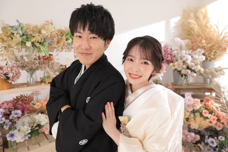 一面お花の壁が登場! 横浜みなとみらい店スタジオで撮影するこだわりのウェディングフォト