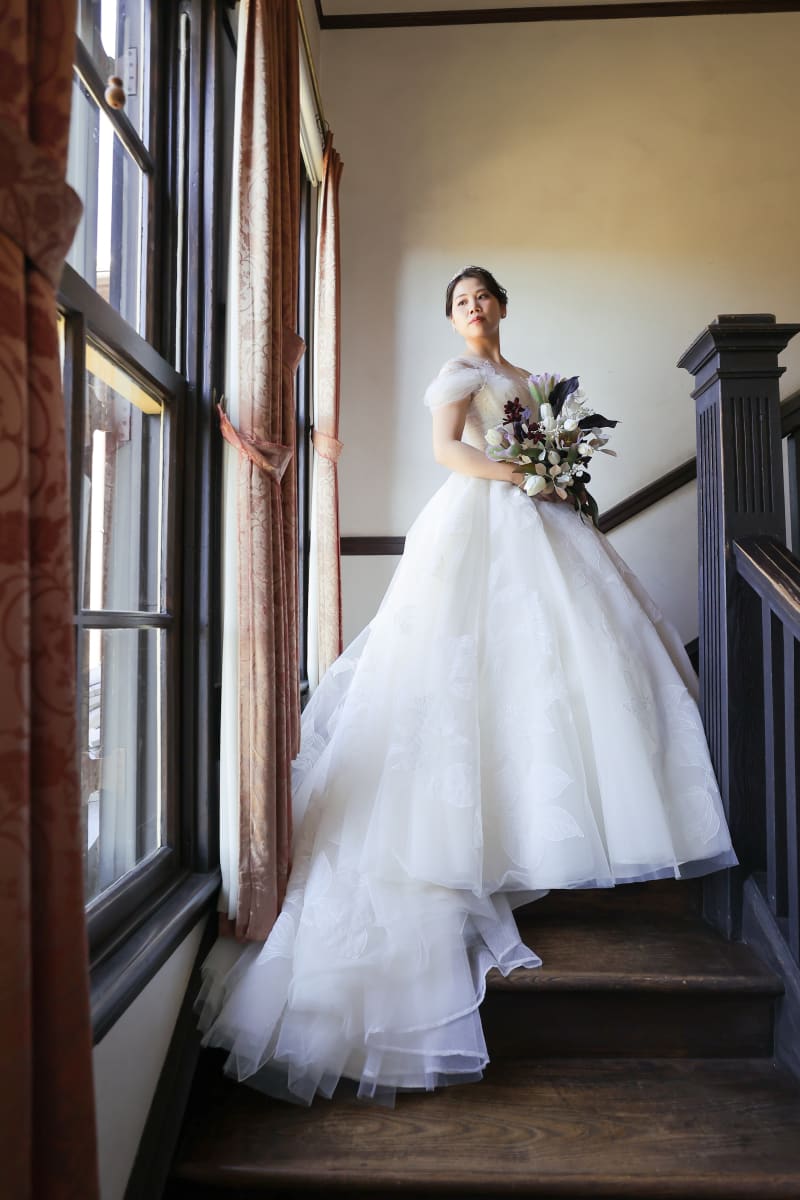 優しいドレープのたっぷりとしたトレーンのドレスがとっても優雅。洋館の雰囲気も相まって貴族のようです・.。.:*☆