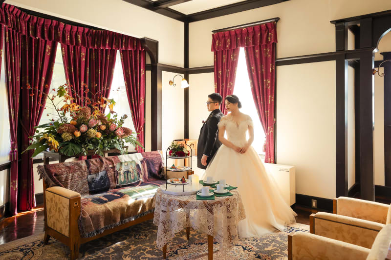 重厚な雰囲気の大客間えんじ色のカーテンが素敵なアクセントの大客間。お二人の選んだお衣装ともピッタリの雰囲気でした・・!