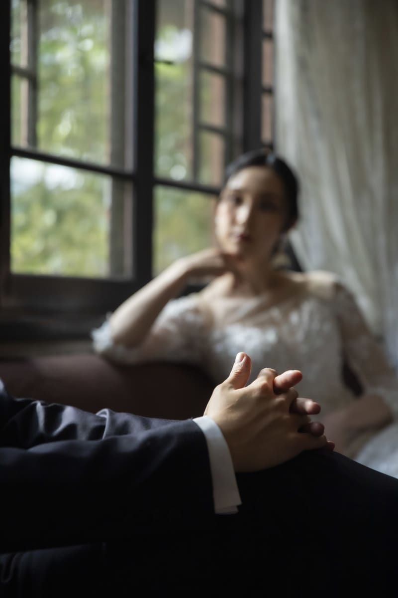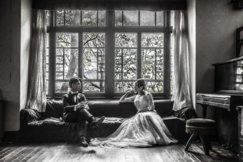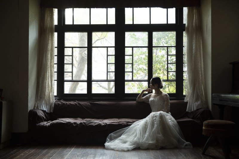 柔らかな光を浴びた新婦様の肌が驚くほどの透明感。陶器のよう。