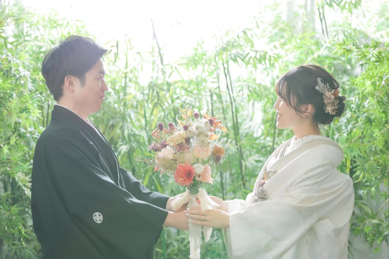 for you光が差し込むようなグリーンを背景に。ブーケも良いポイントですね♪