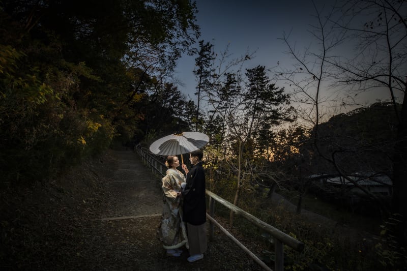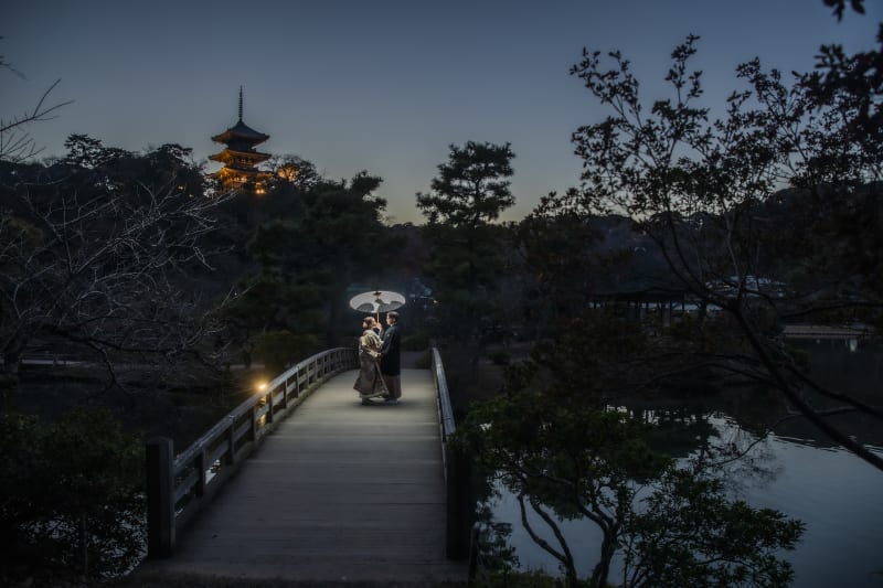フォーマルスタイルは最も和の雰囲気のある場所で。お二人とも決まっています。