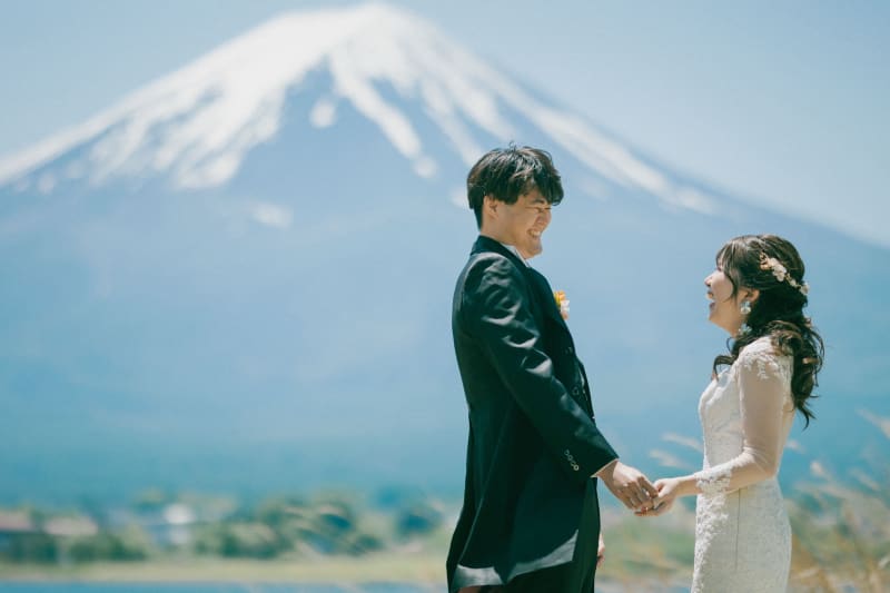 和装と洋装両方で富士山の撮影を楽しめるスペシャルプラン。雪化粧の富士山と撮影できるのは5月末頃までです。
