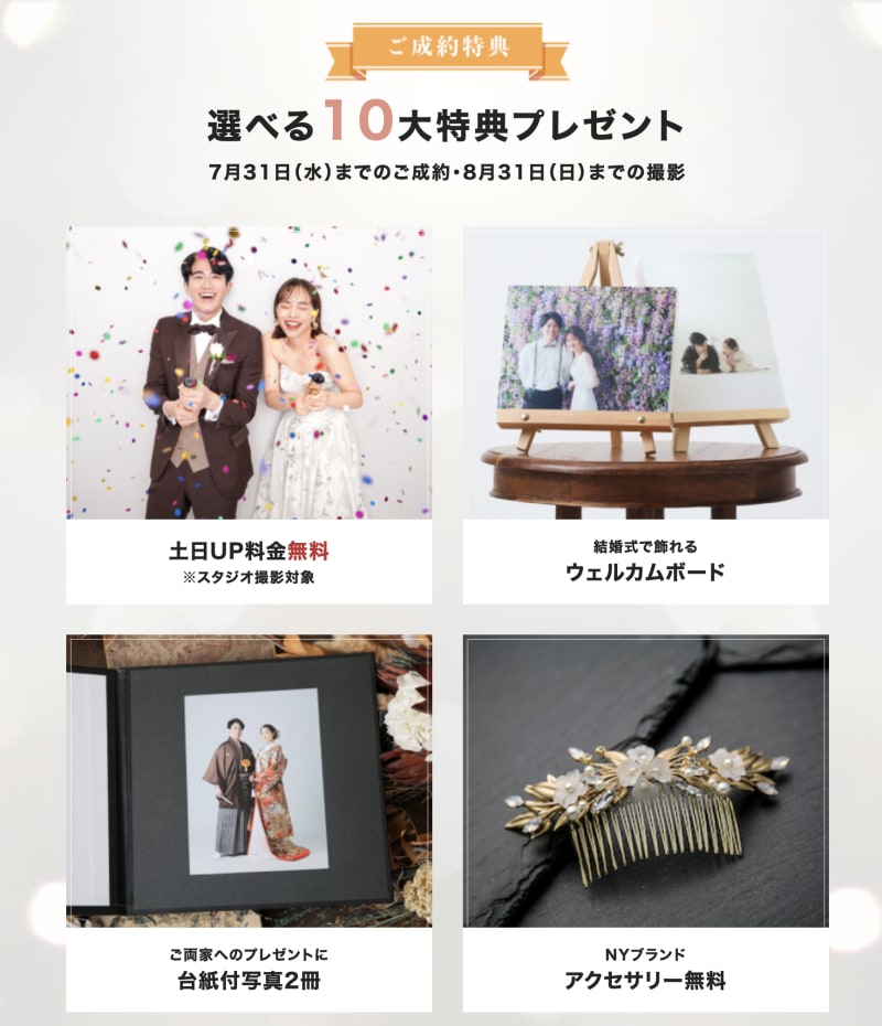 7/31までの期間にご成約、8月末までの撮影のお客様 もれなく、選べる10大特典キャンペーン始まりました!