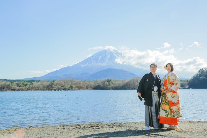 和装と洋装両方で富士山の撮影を楽しめるスペシャルプラン。雪化粧の富士山と撮影できるのは5月末頃までです。