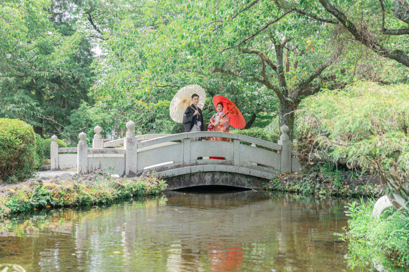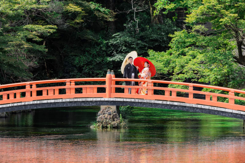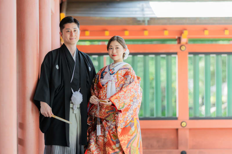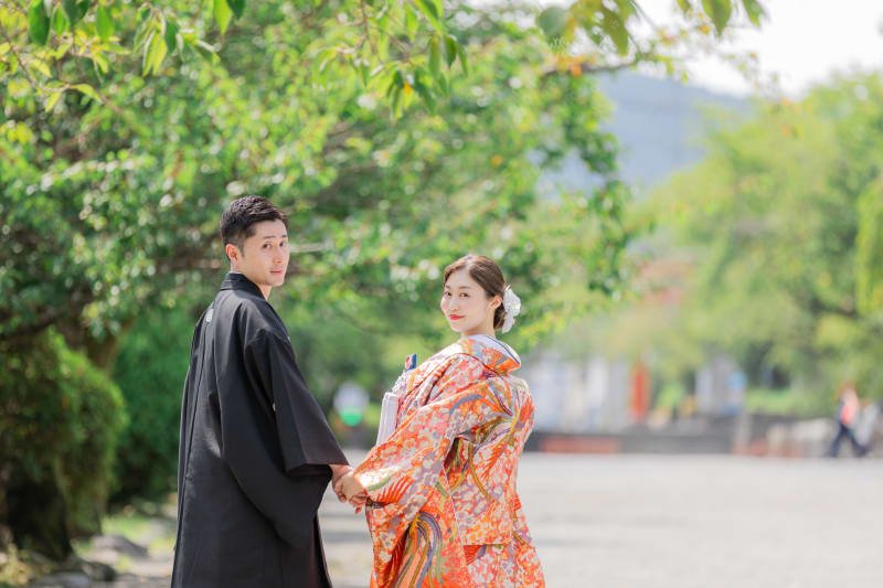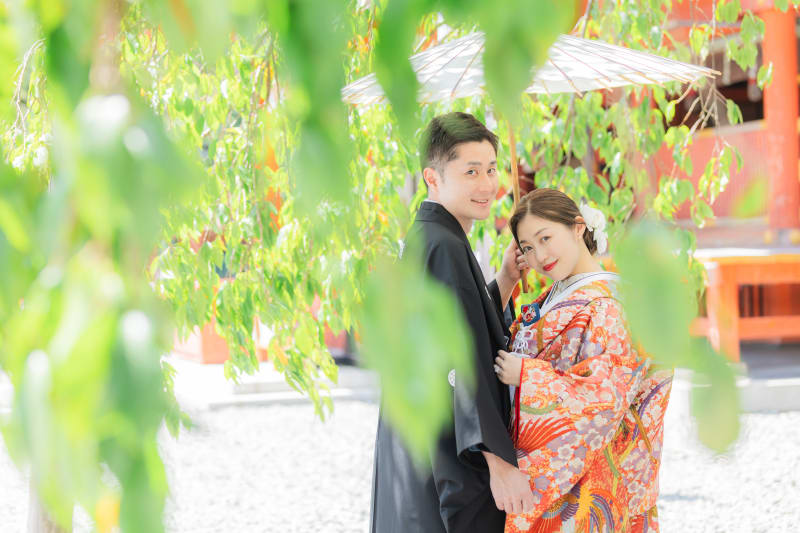 神社和装撮影。鮮やかな色打掛と緑のロケーションの撮影