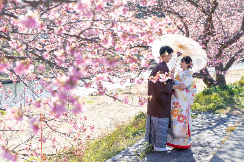 桜や菜の花は3-4月に見ごろを迎える地域も多いですが、伊豆では2月にどちらも満開になるので、春のご結婚式で桜の写真を飾りたいご新郎新婦様へはとっておきの撮影スポットです!!