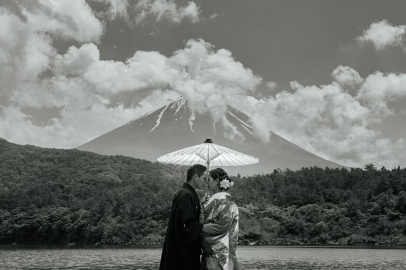 和装と洋装両方で富士山の撮影を楽しめるスペシャルプラン。雪化粧の富士山と撮影できるのは5月末頃までです。