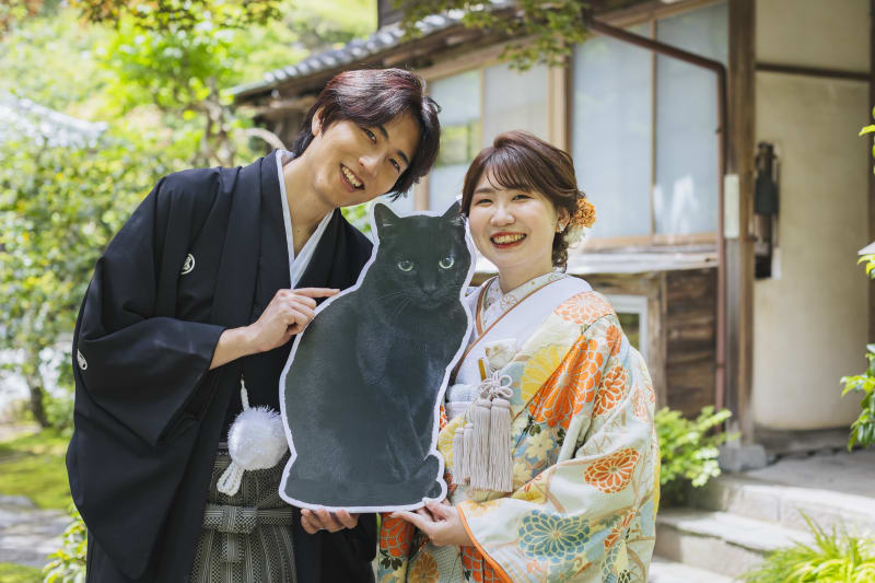 お二人が持ってきてくださった猫ちゃんとのお写真です! 実際にペットと撮影することも可能ですよ