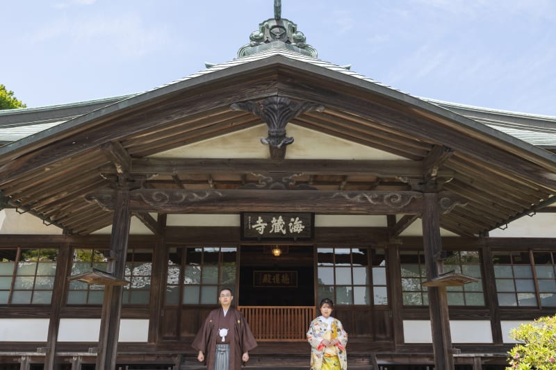 鎌倉にある海蔵寺の正面で佇むお二人。和装との相性バッチリです。