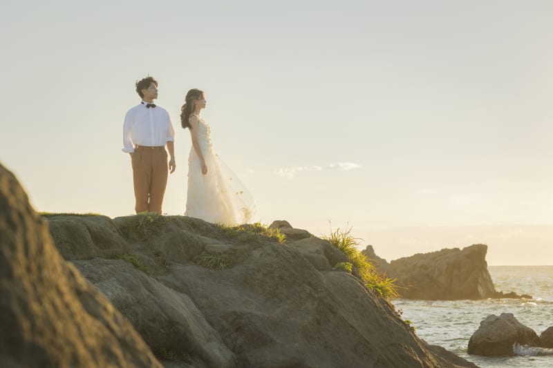 とっても楽しそうに歩くお二人や、砂浜近くにある岩場、草原でもお写真を撮影しました。