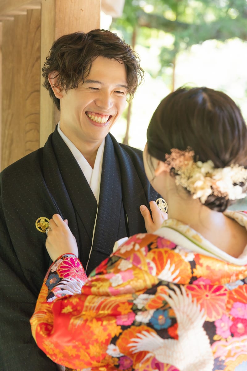 鮮やかな色打掛に黒の紋付き袴で、豪華ながら和装にぴったりな落ち着いた締まった印象に^^