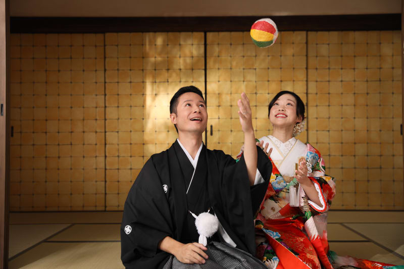 和装の写真の中でカラフルな紙風船はさらに華やかになっておすすめです。