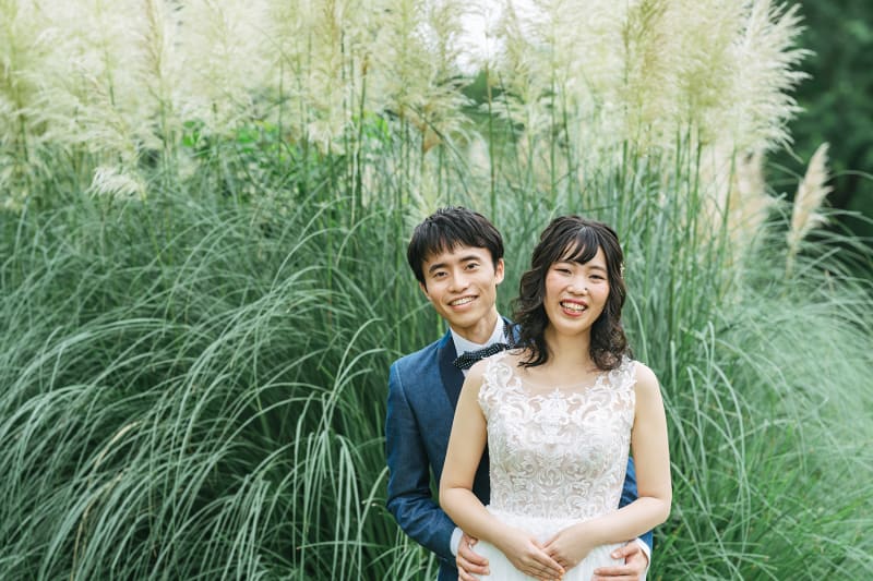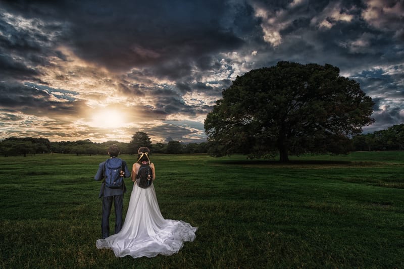 お二人の趣味の登山に使うバックパックを使って撮影。原っぱの真ん中で壮大なイメージで撮影しました。