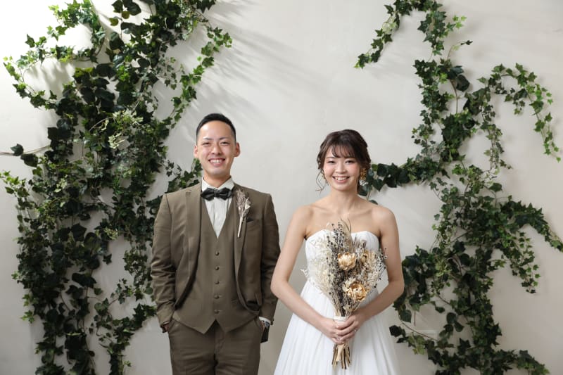 ご新婦様はエンパイアラインの柔らか素材のドレス、ご新郎様はカーキのタキシードに!