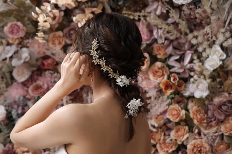 ご新婦様のヘアスタイルは鎖骨下くらいのセミロングの長さを編みおろしにしました。