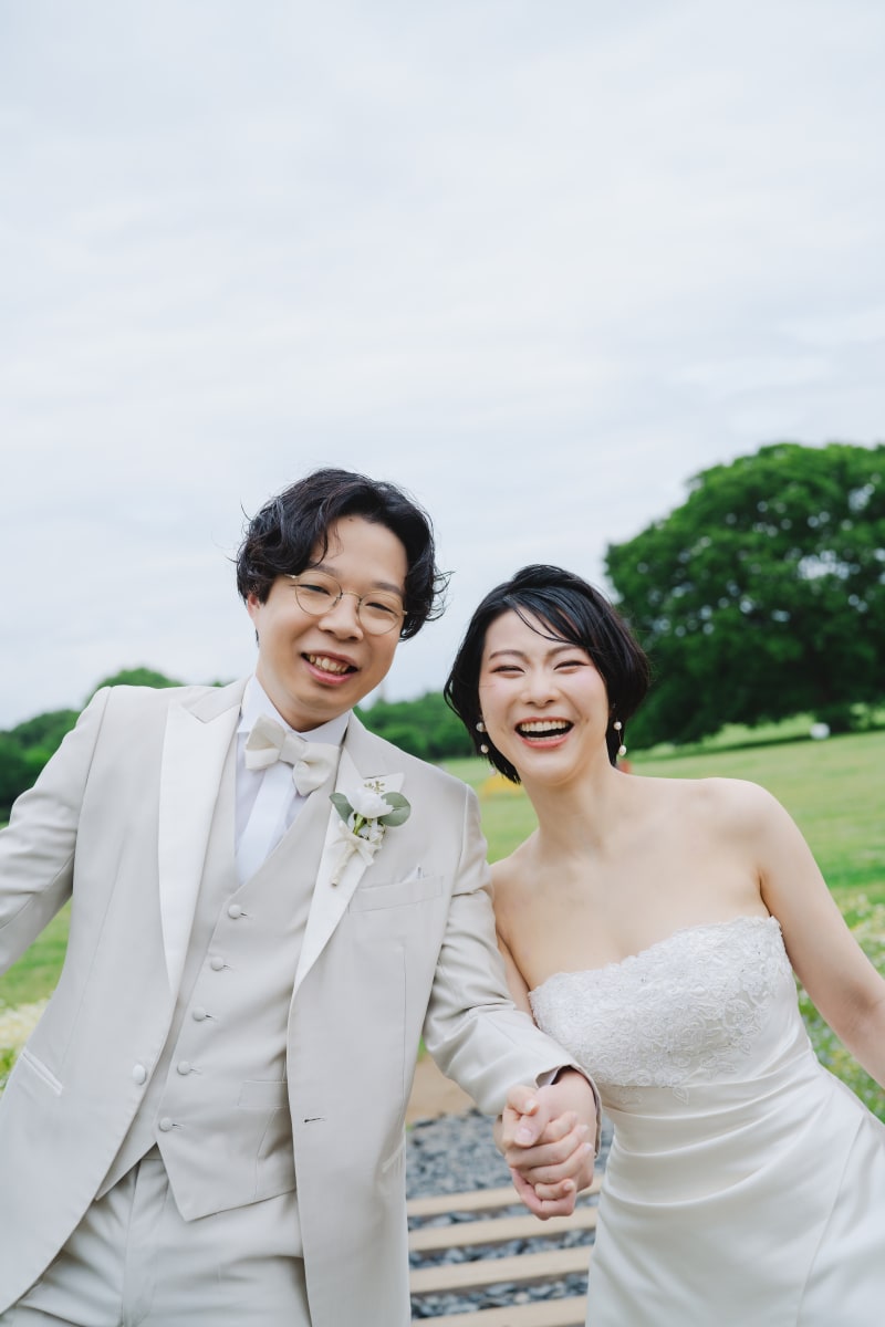 ご新郎様もベージュがかった白いタキシードをご着用いただき、