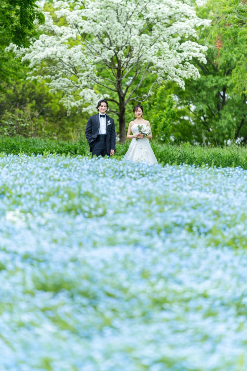ネモフィラと白い花が咲いている木と一緒に