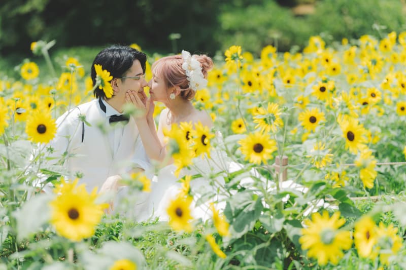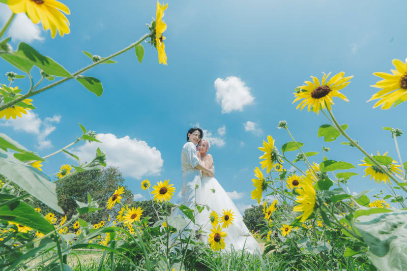 青空と緑とひまわりの黄色に白いウエディングドレスがとても映えます✨