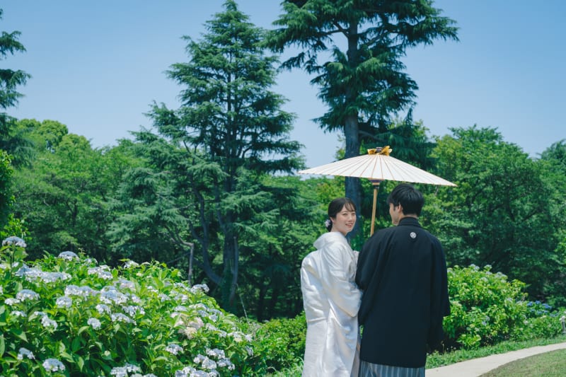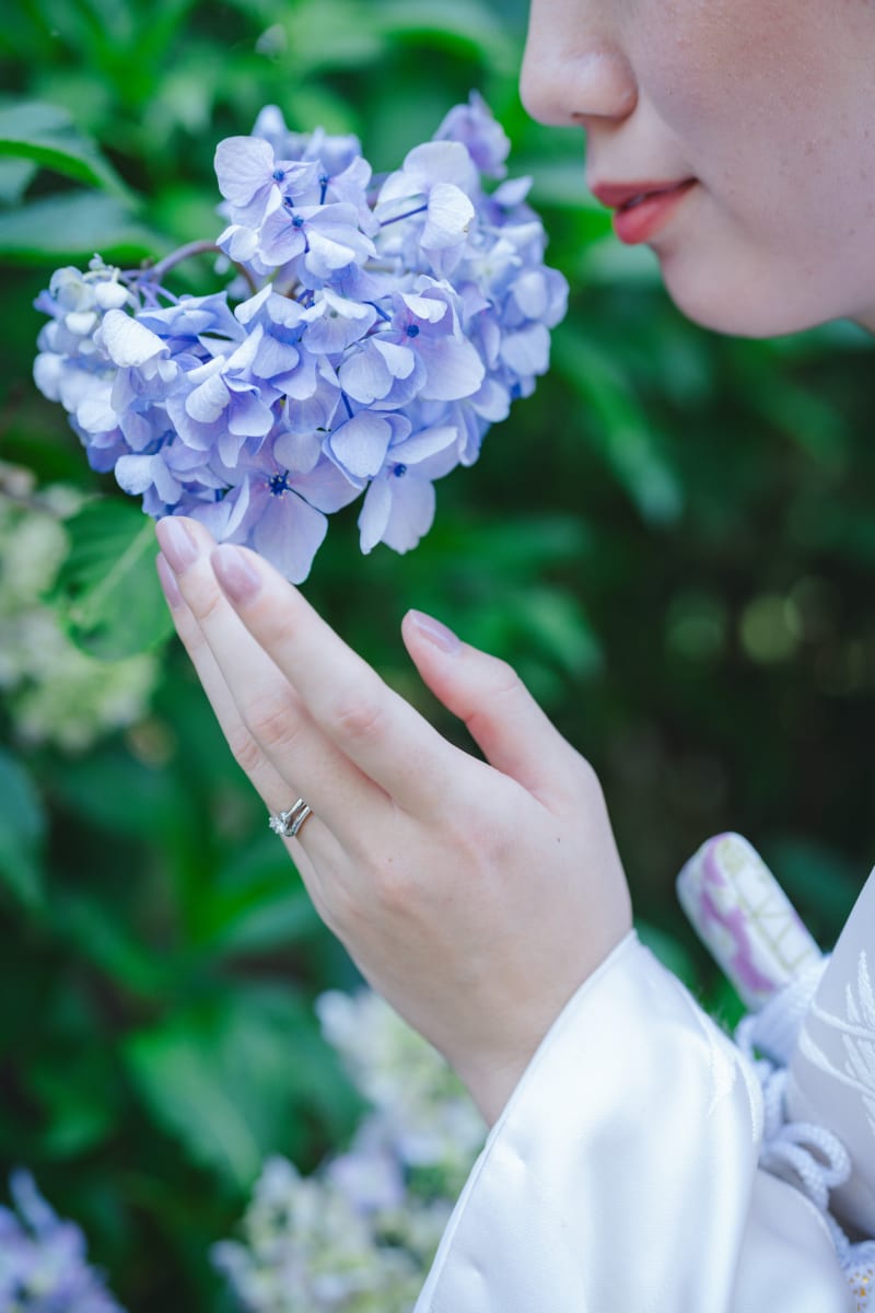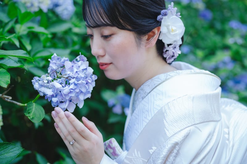 緑と青紫色の紫陽花に白無垢が映えます:)