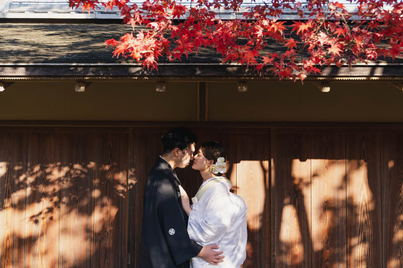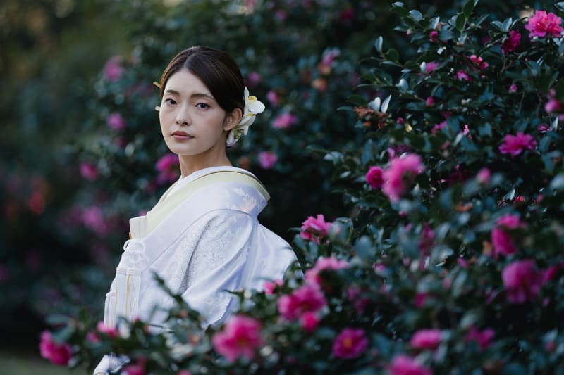この時期は山茶花も綺麗に咲きます。白無垢との相性も抜群です。